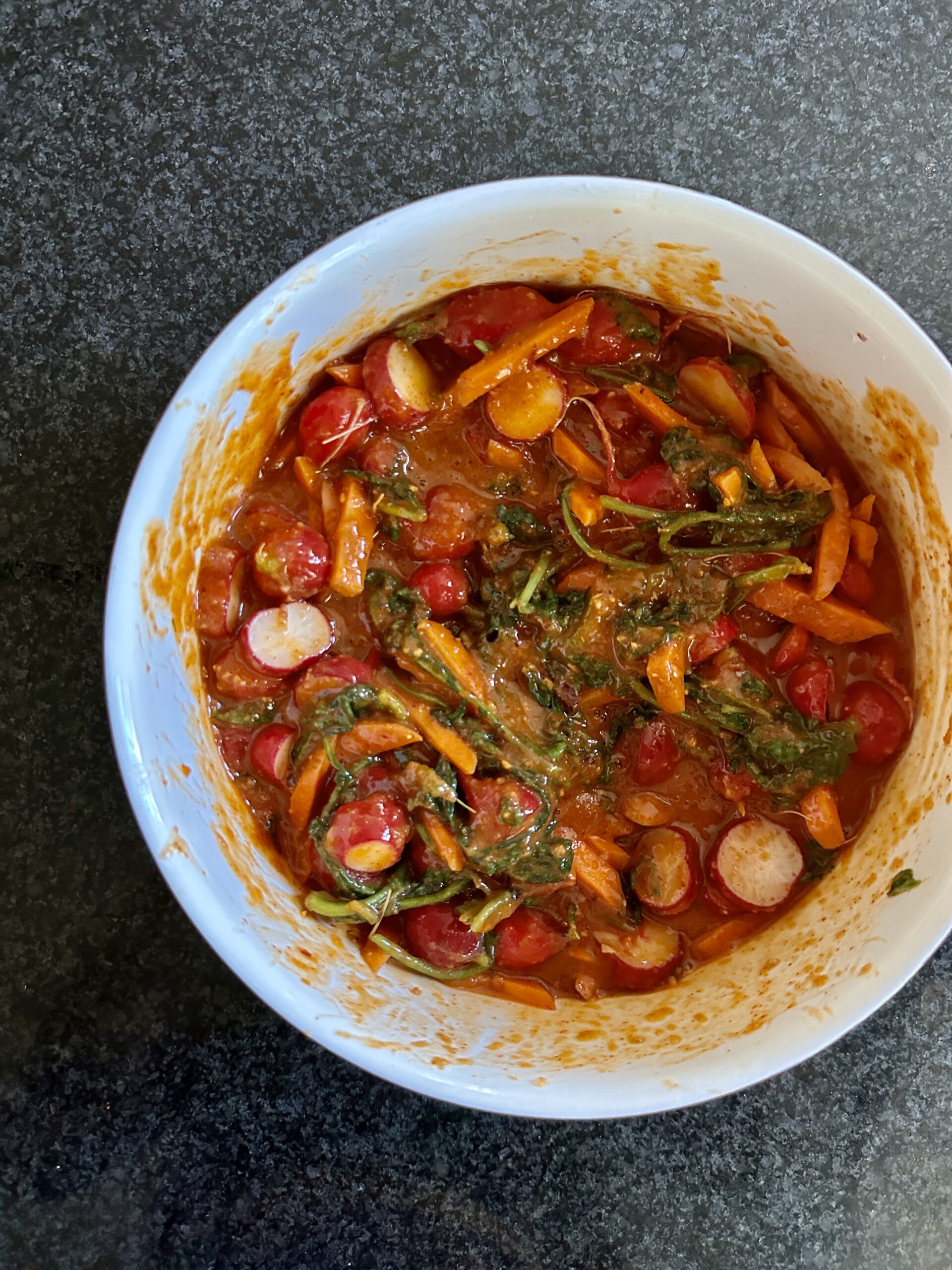 Leaves that usually end up in the compost can take center stage. I used radish leaves, but carrot, cauliflower, beet, broccoli leaves… anything left over is welcome here, because this is where they find new life. This kimchi is an invitation to look at what we often discard with different eyes — and transform it into a vibrant, rich, and surprising ferment.